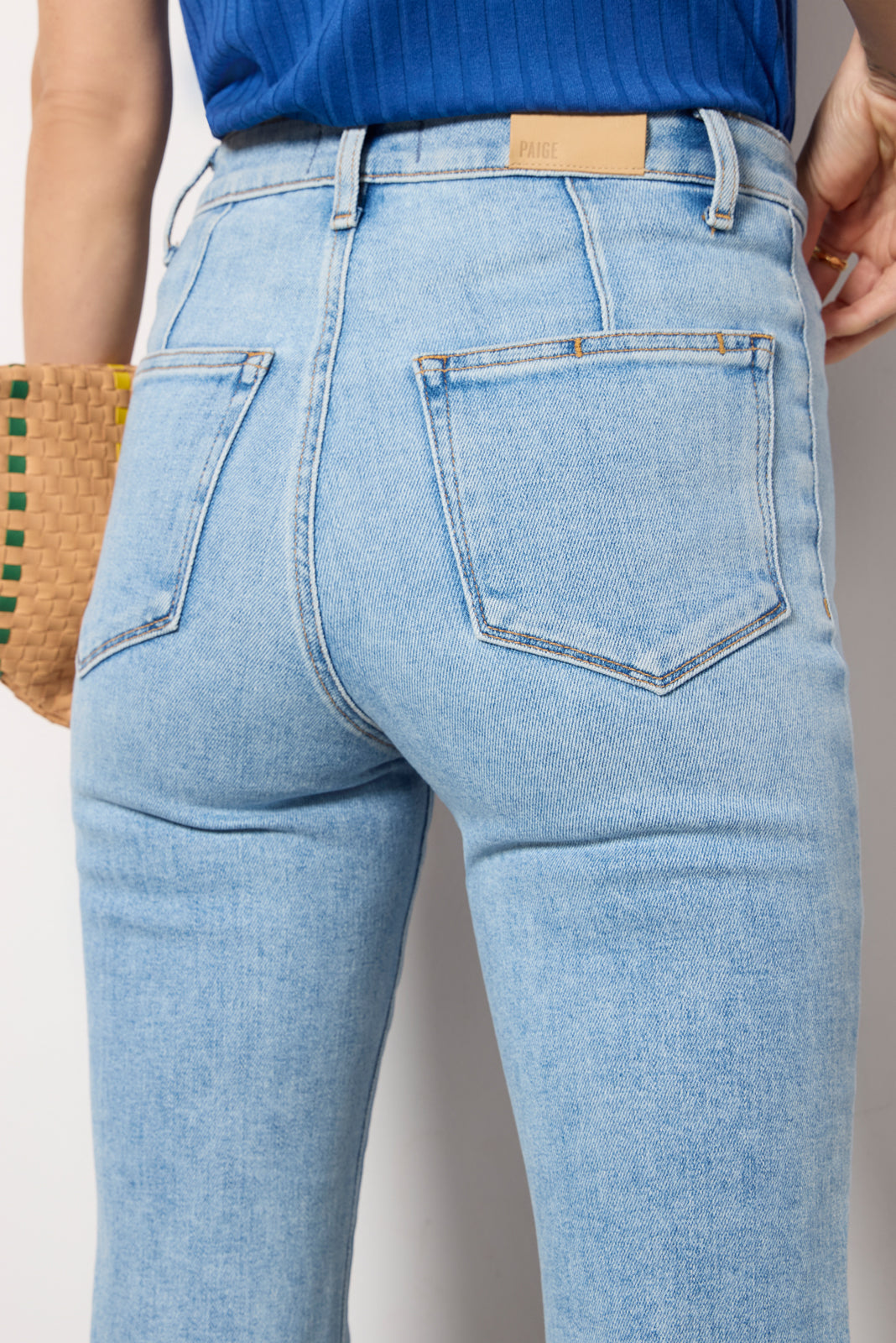 Welt pockets define the flattering Marlow Skimmer Jean from Paige, featuring stretch cotton denim, high-rise waist, and a flare leg silhouette with a full-length inseam.
