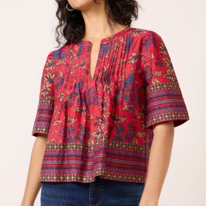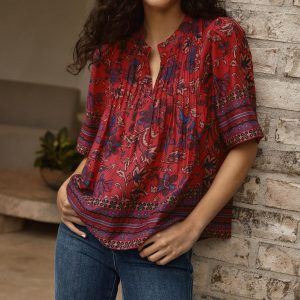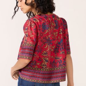 Finished in flowy cotton fabric, this floral boho blouse by EVEREVE features a split neckline with pintuck detailing, elbow-length sleeves, and a contrasting border print.