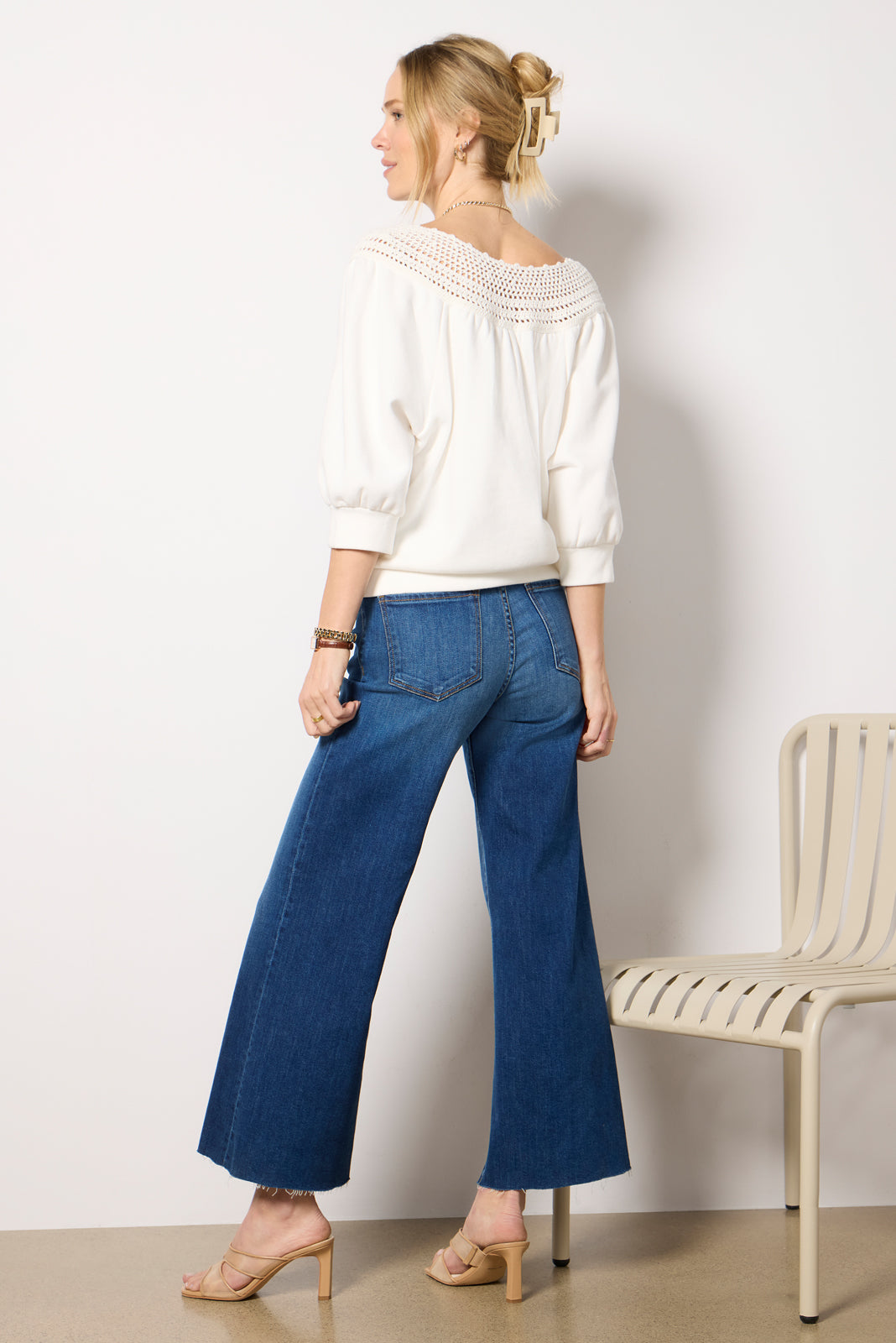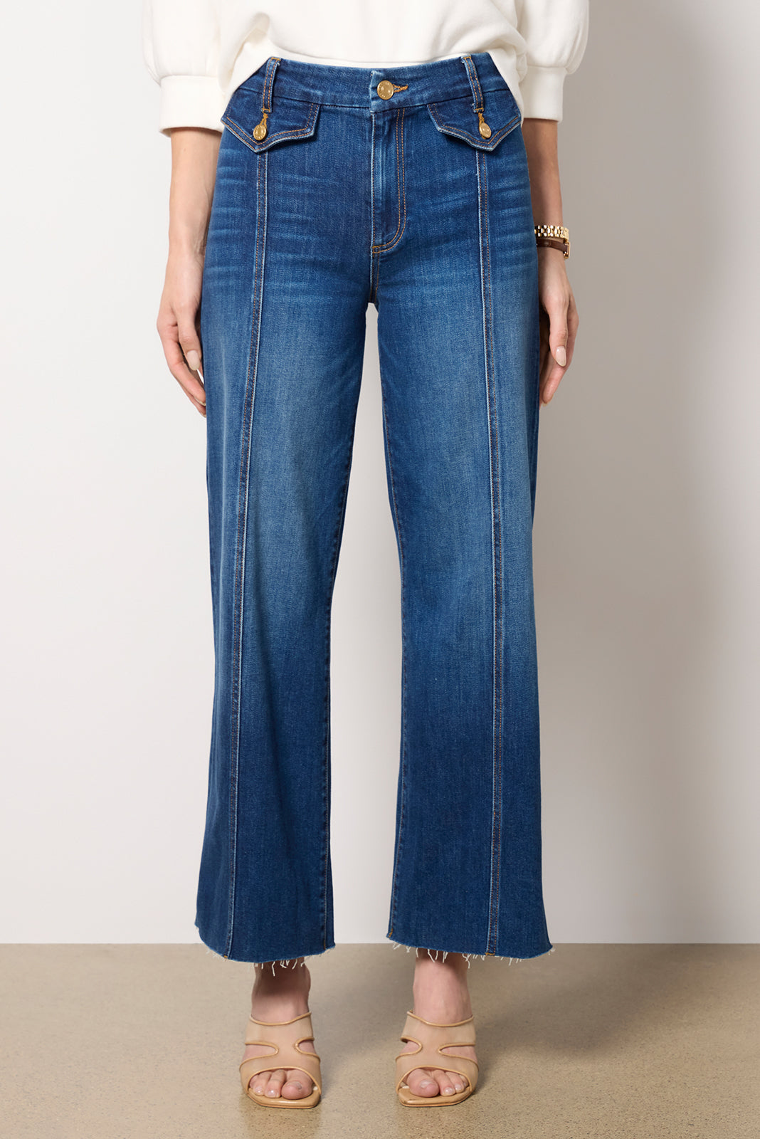Crafted in a stretch cotton denim, the Meg Jean by Kut from the Kloth features a mid-rise waist, patch pockets with gold buttons, and front seam detailing.