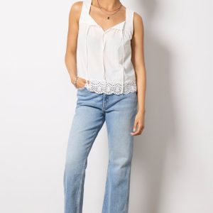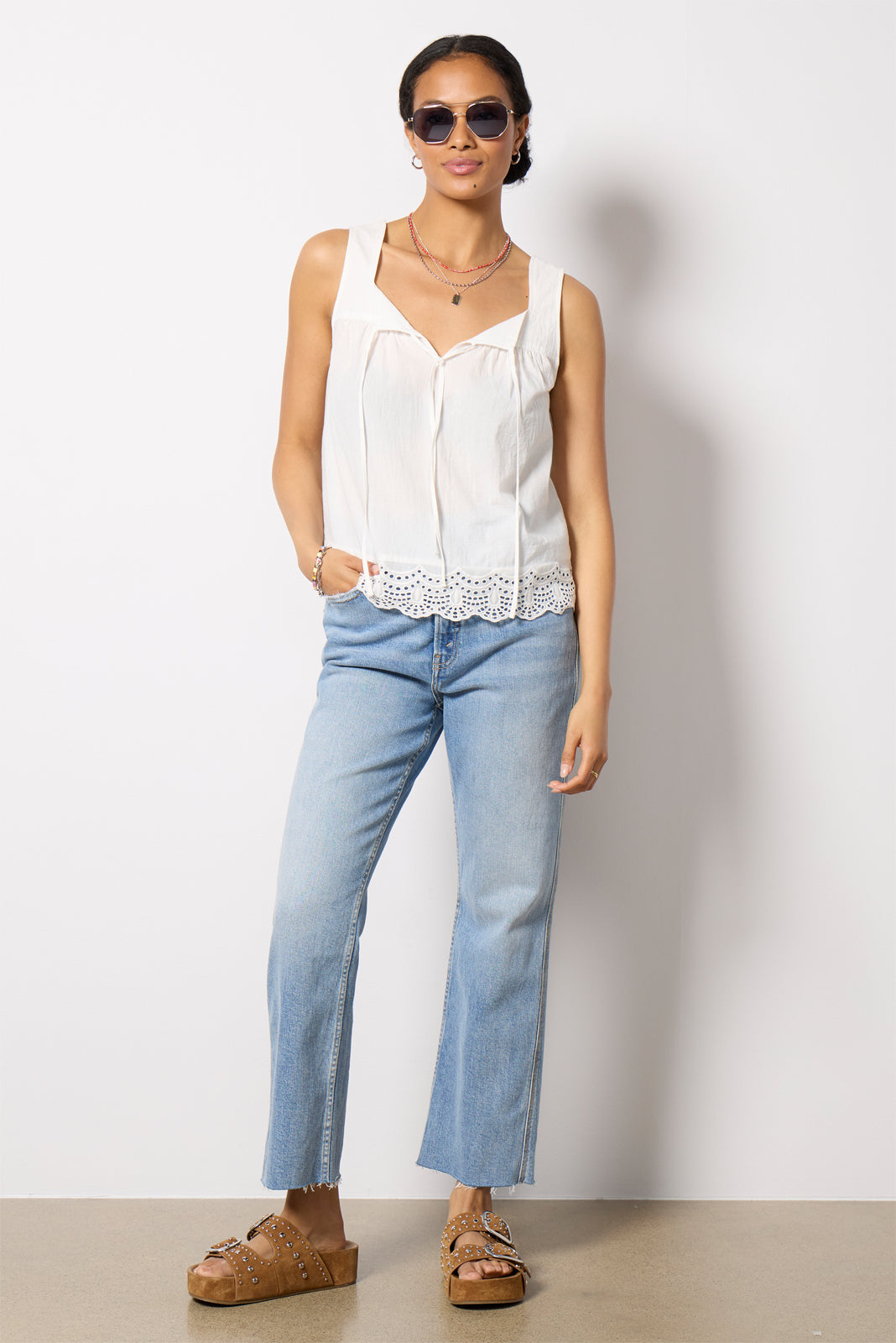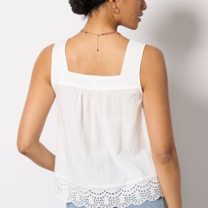 A scalloped eyelethemelevates this sweet and summery tank by EVEREVE,featuring a relaxed fit, flowy cotton fabric, and a square neckline with tie details.