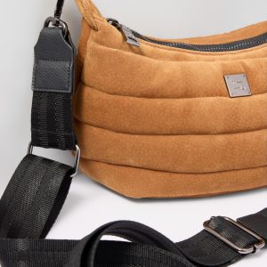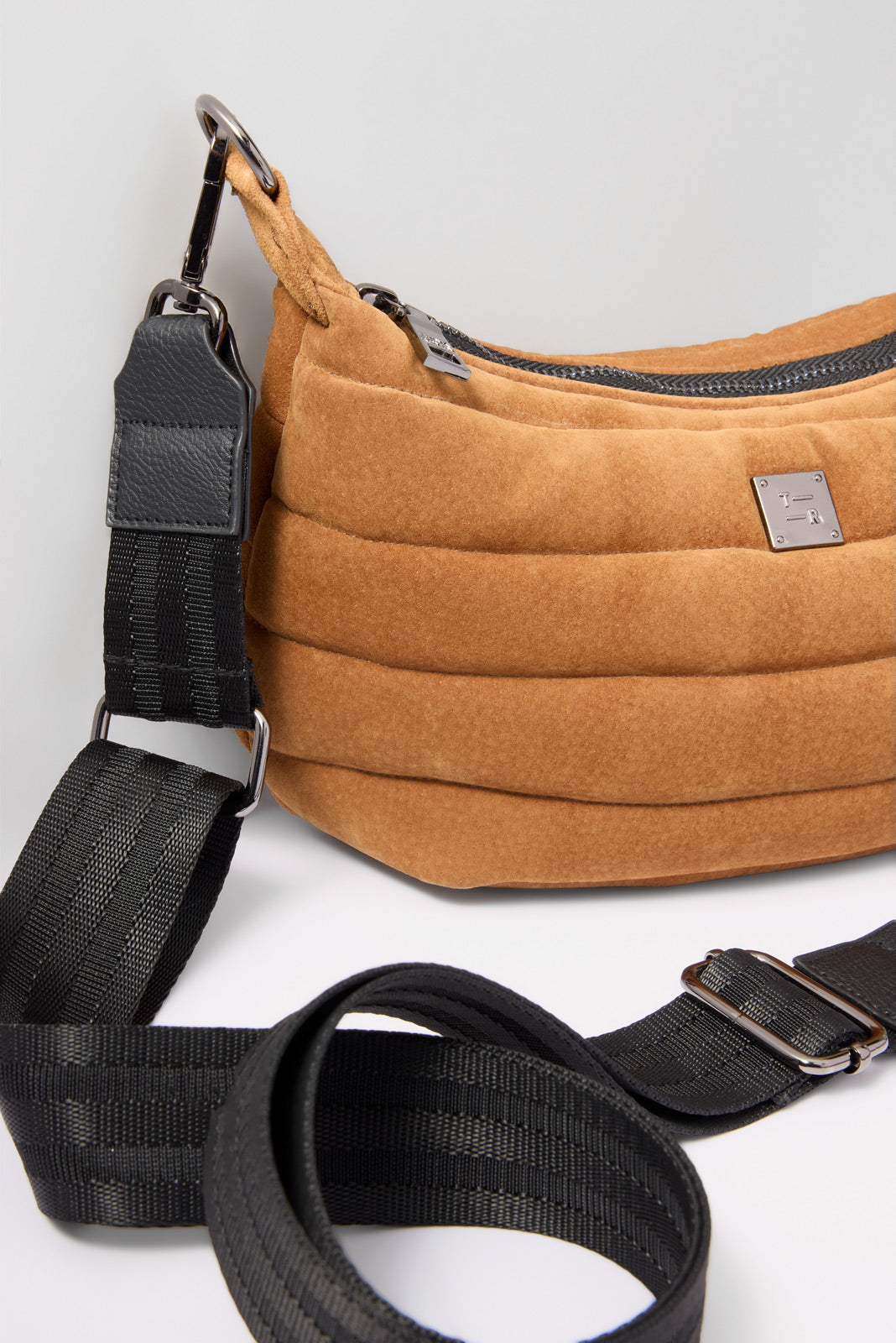 Crafted in soft, luxe suede, the Moon Goddess Bag by Think Royln features a top zip closure and two detachable strap options—ametal chainstrap to wear on the shoulder or an adjustable crossbody strap to go hands-free.