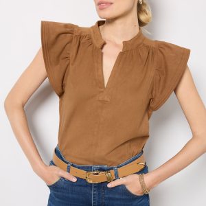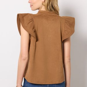 Feminine flutter sleeves elevate this stylish faux suede top by Melissa Nepton, finished with a split neckline and vertical center seam detail.
