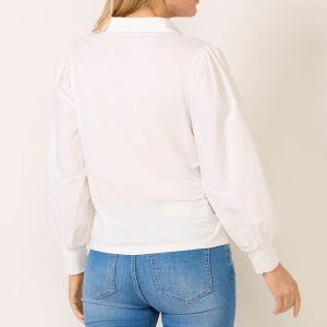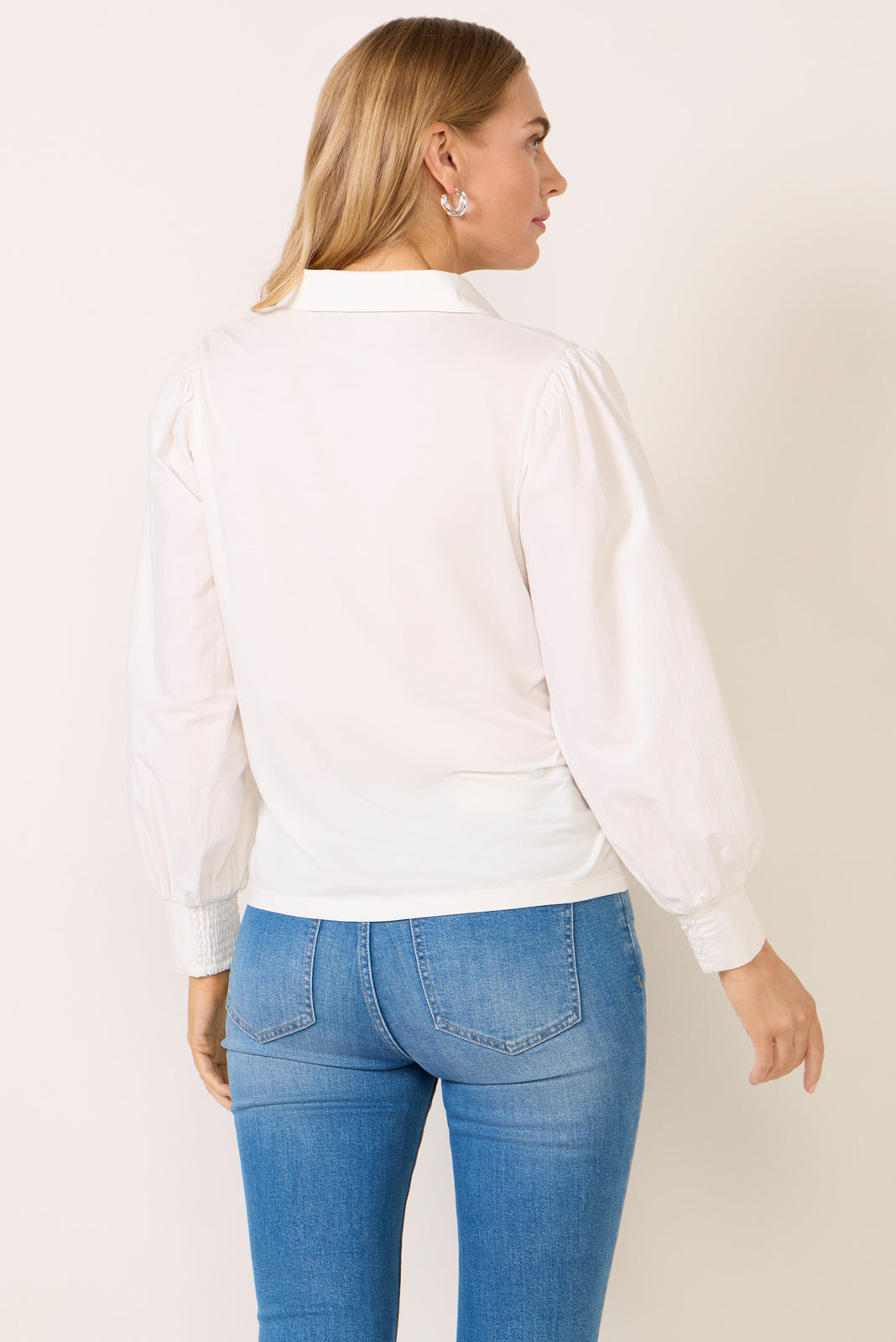 Upgrade your workwear wardrobe with the Nelly Mixed Media Top by EVEREVE, featuring a classic collar, half front button placket, long sleeves with gathering at the shoulders, and smocking details at the cuffs.