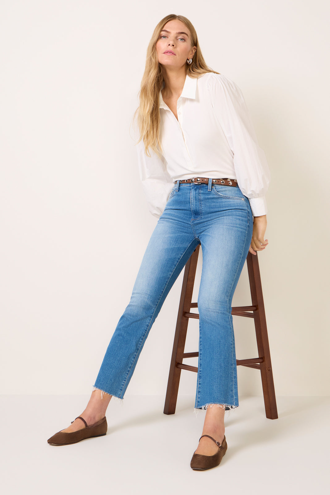 Upgrade your workwear wardrobe with the Nelly Mixed Media Top by EVEREVE, featuring a classic collar, half front button placket, long sleeves with gathering at the shoulders, and smocking details at the cuffs.