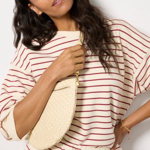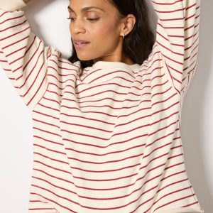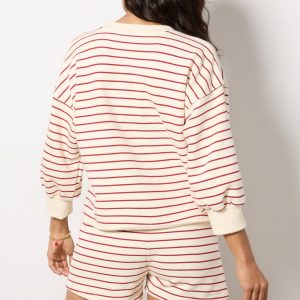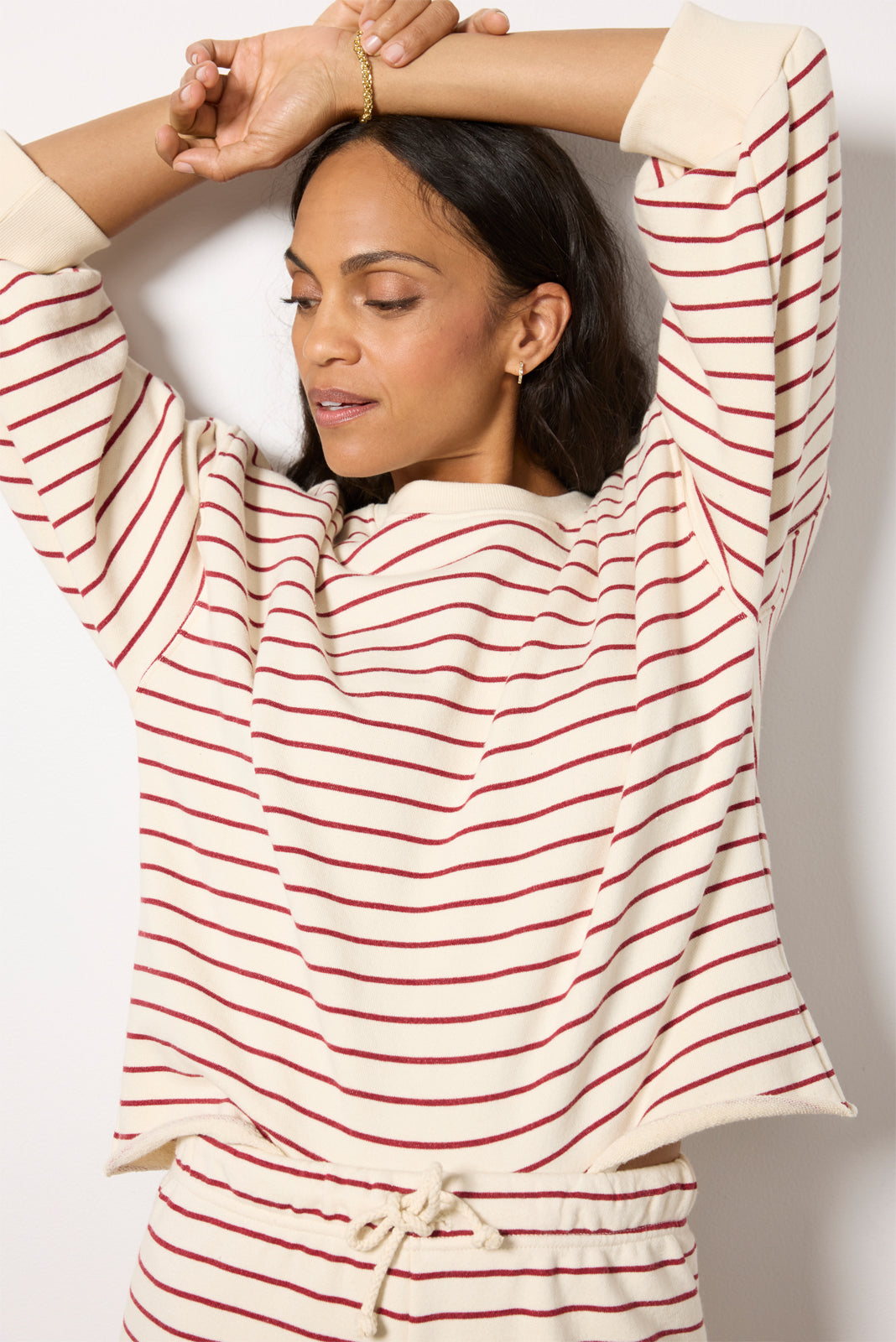 Finished in comfy French terry fabric, the Niall striped sweatshirt by perfectwhitetee features a crewneck silhouette, raw edge hem, and three-quarter sleeves with ribbed cuffs. Make it a matching set with the coordinating Bennie Striped Short.