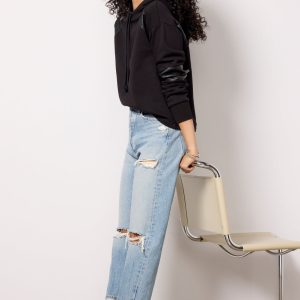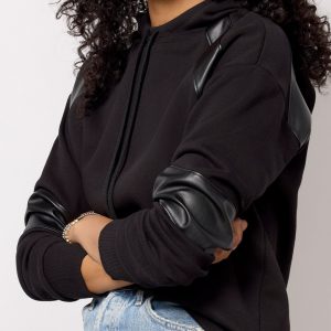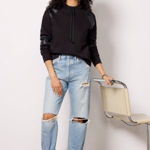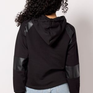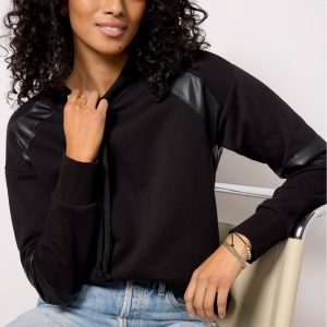 Faux leather panels add a stylish edge to the Nickie sweatshirt by EVEREVE, crafted in cotton-blend fabric with a relaxed fit, ribbed cuffs, and an adjustable drawstring hood.
