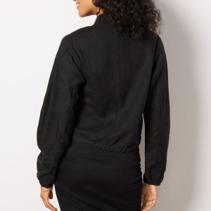 This linen bomber jacket by EVEREVE will be your go-to summer layer. Finished with an adjustable tie hem, the Noa jacket features a relaxed, cropped silhouette with a front zipper closure, side pockets, and a rib knit collar.