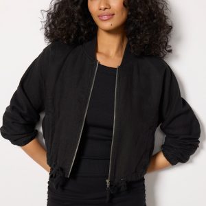 This linen bomber jacket by EVEREVE will be your go-to summer layer. Finished with an adjustable tie hem, the Noa jacket features a relaxed, cropped silhouette with a front zipper closure, side pockets, and a rib knit collar.