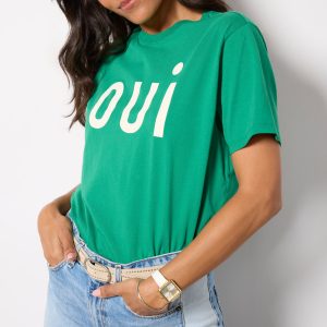 Designed with a casual-cool vibe, the Original Tee by Clare V. is crafted in soft cotton fabric and features a relaxed, slightly oversized silhouette with “Oui” lettering across the front.