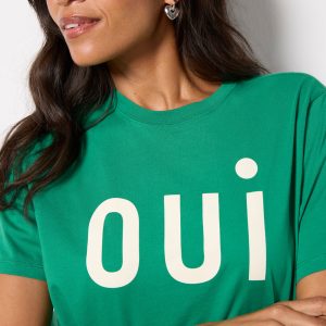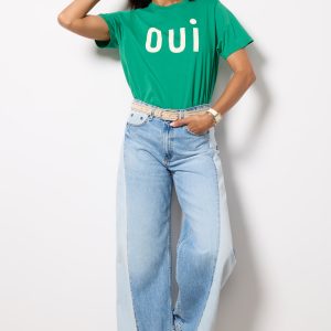 Designed with a casual-cool vibe, the Original Tee by Clare V. is crafted in soft cotton fabric and features a relaxed, slightly oversized silhouette with “Oui” lettering across the front.