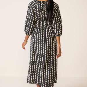 Chic and eye-catching, the Paio printed midi dress by Rails features a lined silhouette with an elasticized bodice, three-quarterpuff sleeves, and a v-neckline with a hook-and-eye closure.