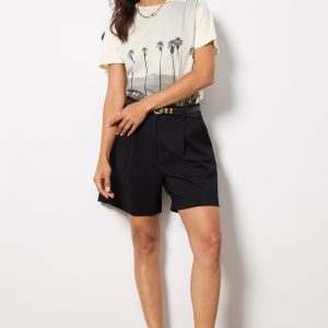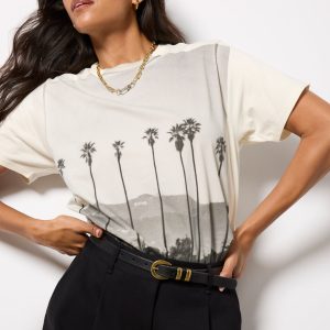 Designed with a casual-cool vibe, the Original Tee by Clare V. is crafted in soft cotton fabric and features a relaxed, slightly oversized silhouette with a Hollywood palm tree graphic printed on the front.
