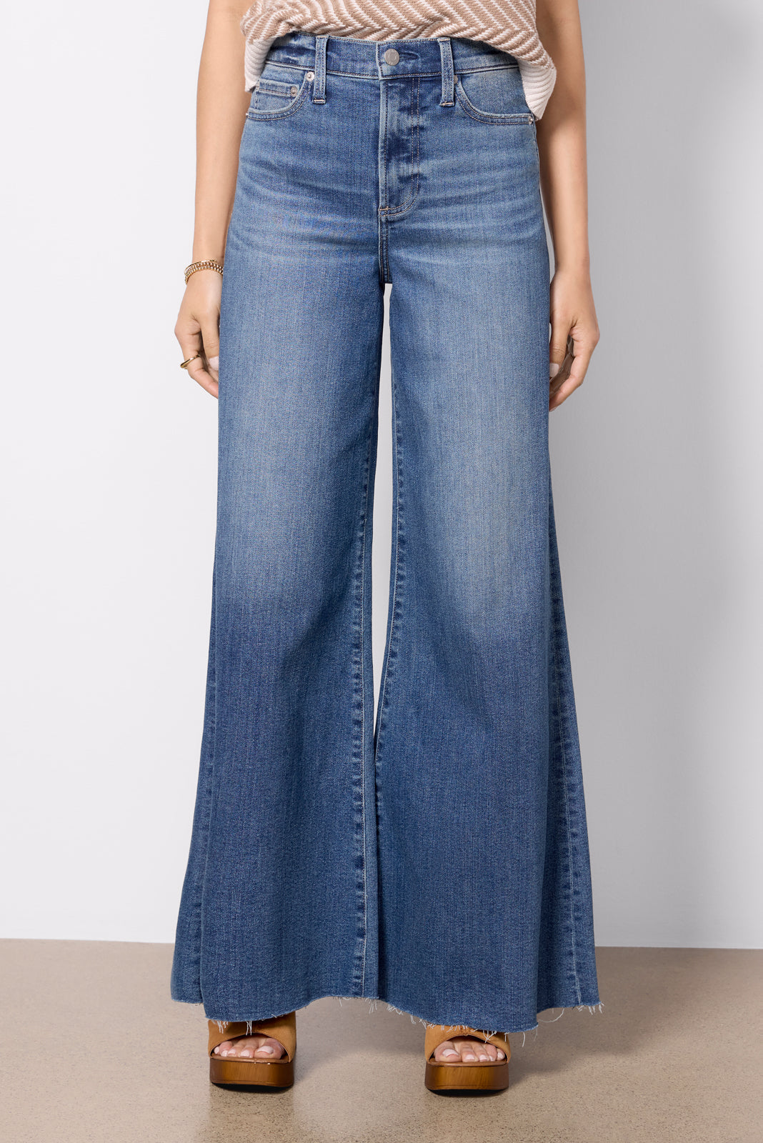 The Petite Izzy wide leg jean by Pistola will take you from day to night in style. Designed with a shorter rise and inseam for petite frames, this mid-rise jean features an exaggerated wide leg, full-length raw hems, and a faded blue wash.
