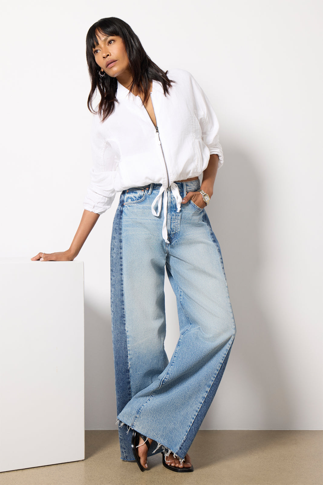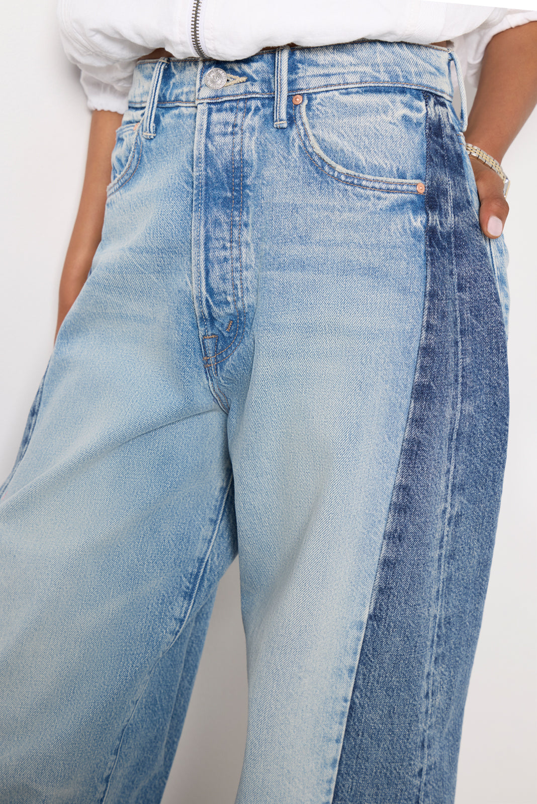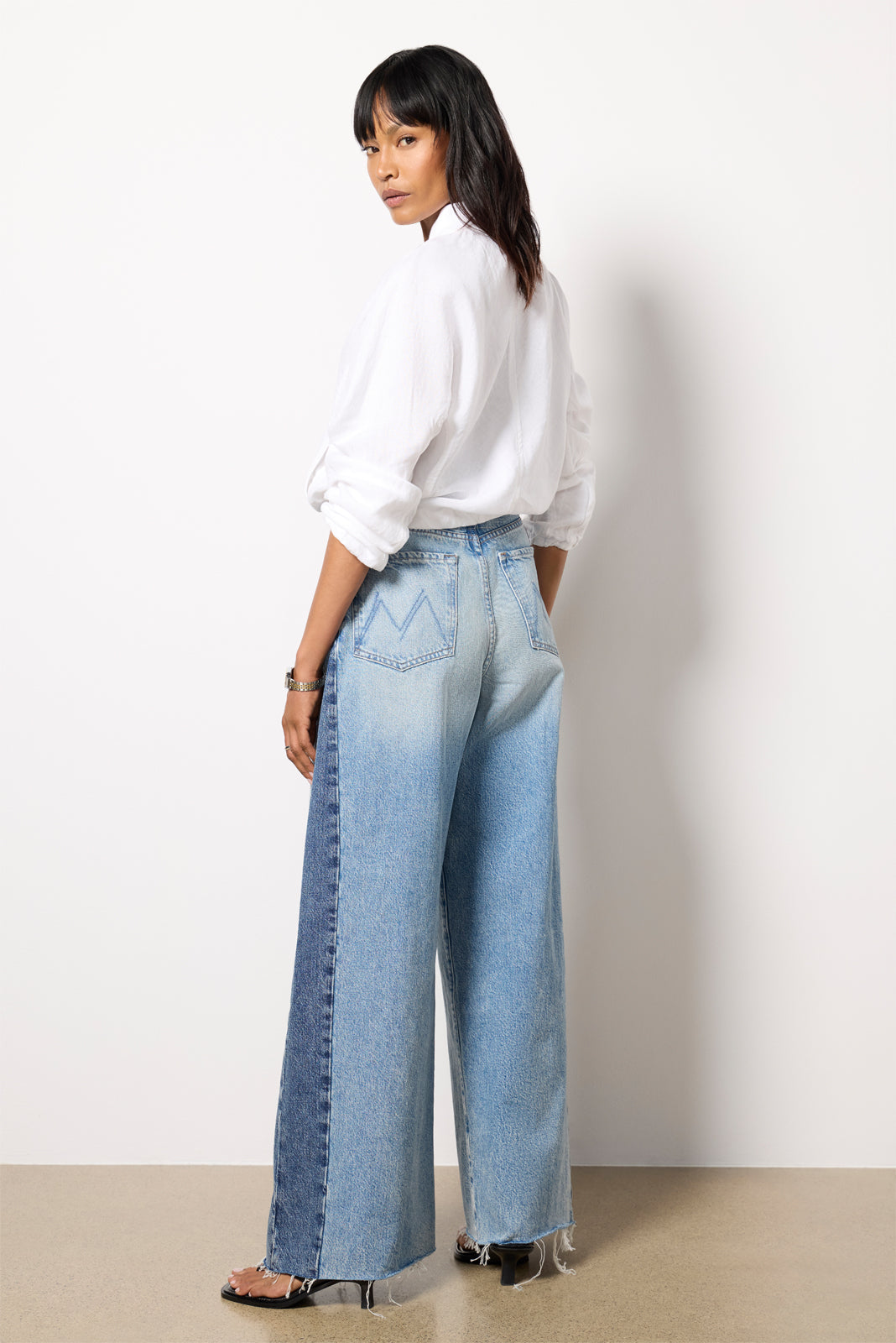 Designed with contrasting side panels, these stylish wide leg jeans by MOTHER are crafted from non-stretch cotton denim and feature a relaxed silhouette with a high-rise waist, 32″ inseam, and raw hems.