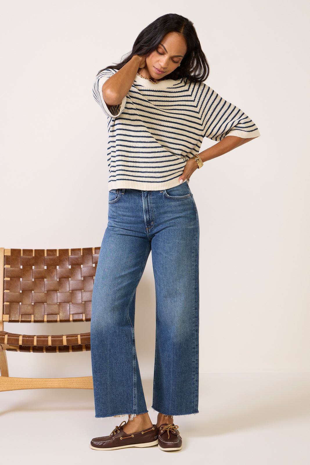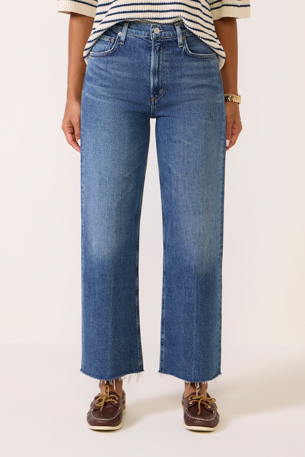 Crafted in soft, sustainable denim fabric, the Ren Jean by AGOLDE features a wide leg silhouette with a high-rise waist and ankle-length raw hems. The versatile blue wash makes them perfect for day-to-night wear.