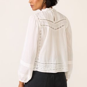 Designed with lace insets and pintuck detailing, this gorgeous cotton blouse by Rails features a ruffled collar, backkeyhole button closure, and long sleeves with elastic cuffs.