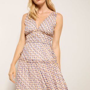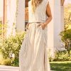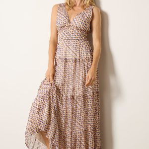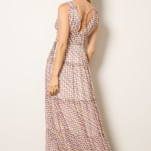 Whimsical and perfect for all your warm-weather events, the Rochelle Maxi Dress by Kivari features a V-neckline with soft underbust seams, a tiered skirt with gathered hem frill, an open back with tie closure, and is complete with an adjustable drawcord at the waist.