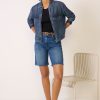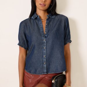 Perfect for wearing day or night, this denim button-down shirt by Cloth & Stone is crafted from soft lyocell chambray and features a ruffled collar, relaxed fit, and short sleeves with elastic cuffs.