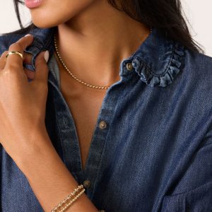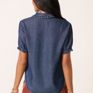 Perfect for wearing day or night, this denim button-down shirt by Cloth & Stone is crafted from soft lyocell chambray and features a ruffled collar, relaxed fit, and short sleeves with elastic cuffs.