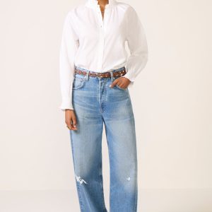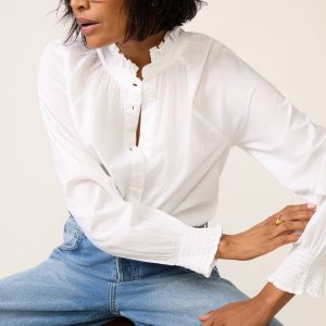 Perfect your workwear collection with this button down by Bobi, featuring a ruffle neckline, long sleeves with smocked cuffs, and a relaxed silhouette.