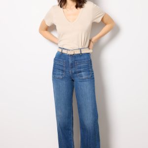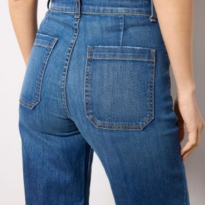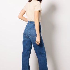 Crafted in comfortable stretch cotton denim, the Salior Pant by ASKK NY features a high-rise waist, front patch pockets, and a full-length inseam with a trouser hem.