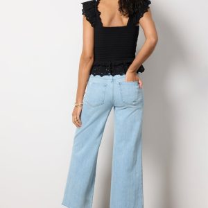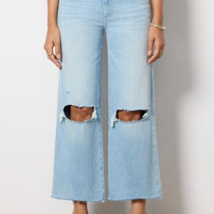Distressed details give an easy, lived-in feel to the Sasha wide leg jean by Paige,crafted in soft light-wash denim with a high-rise fit and ankle-length raw hems—perfect for wearing day or night.