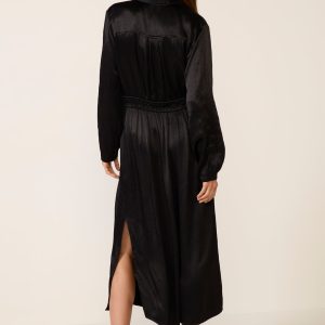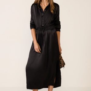 Finished in a sleek satin fabric, this midi shirt dress byCloth and Stone features a point collar, partial front buttons, an elastic waistband with an adjustable drawstring, and a side slit for easy movement.