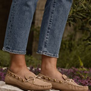 Gorgeous gold stud details define the Sennett Moccasin by Vince Camuto, featuring a suede upper, rubber sole, and tonal whipstitching.