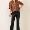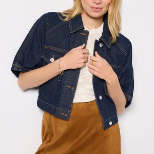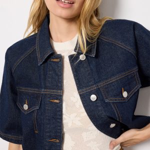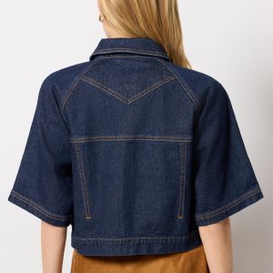 This short sleevedenim jacket by Avec Les Filles is the perfect transitional layer,crafted from dark-wash denim with a cropped fit, front button closures, and two chest pockets.
