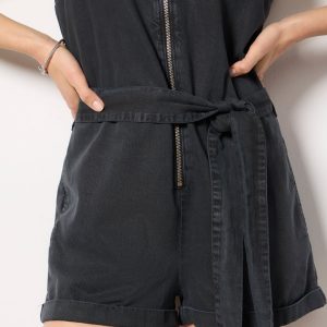 The perfect one-and-done summer outfit, this denim romper by Cloth and Stone features a front zip closure, a pointed collar, side pockets, and a tie belt at the waist.