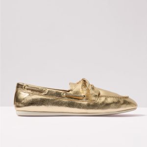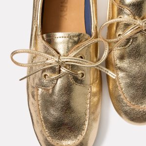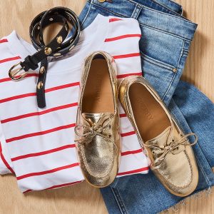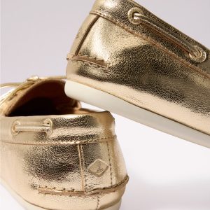 Eye-catching gold leather updates these classic boat shoes by Sperry, featuring a sleek moccasin-style construction, round toe, and high-traction rubber outsole.