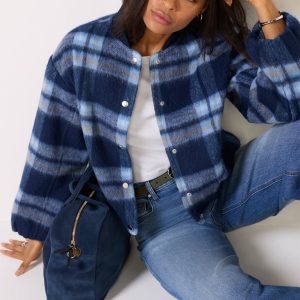 Refresh your fall layering collection with the Sofie jacket by Melissa Nepton. Finished with roomy long sleeves, this plaid bomber jacket features a round neckline, front snap closures, and side pockets.