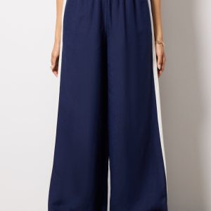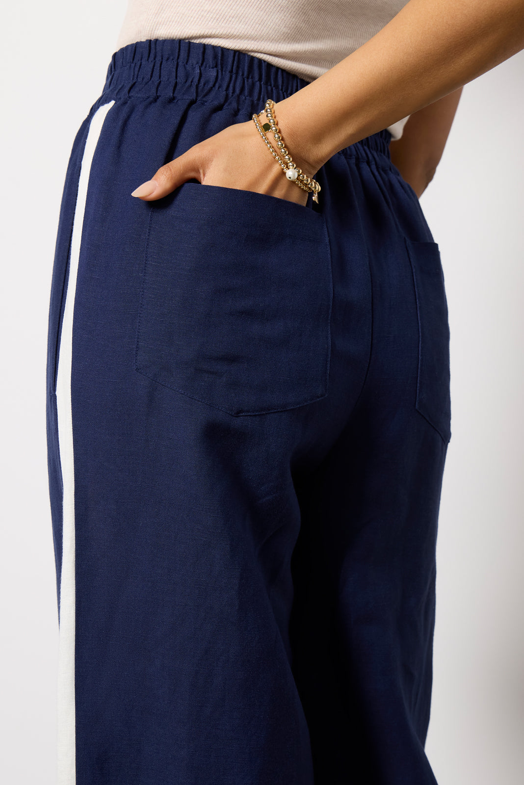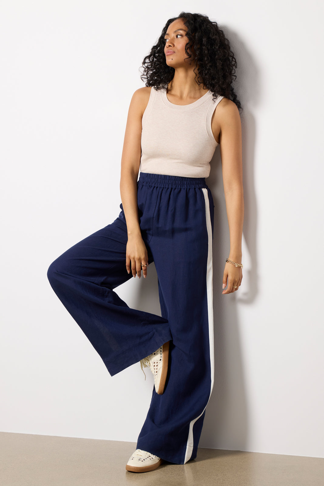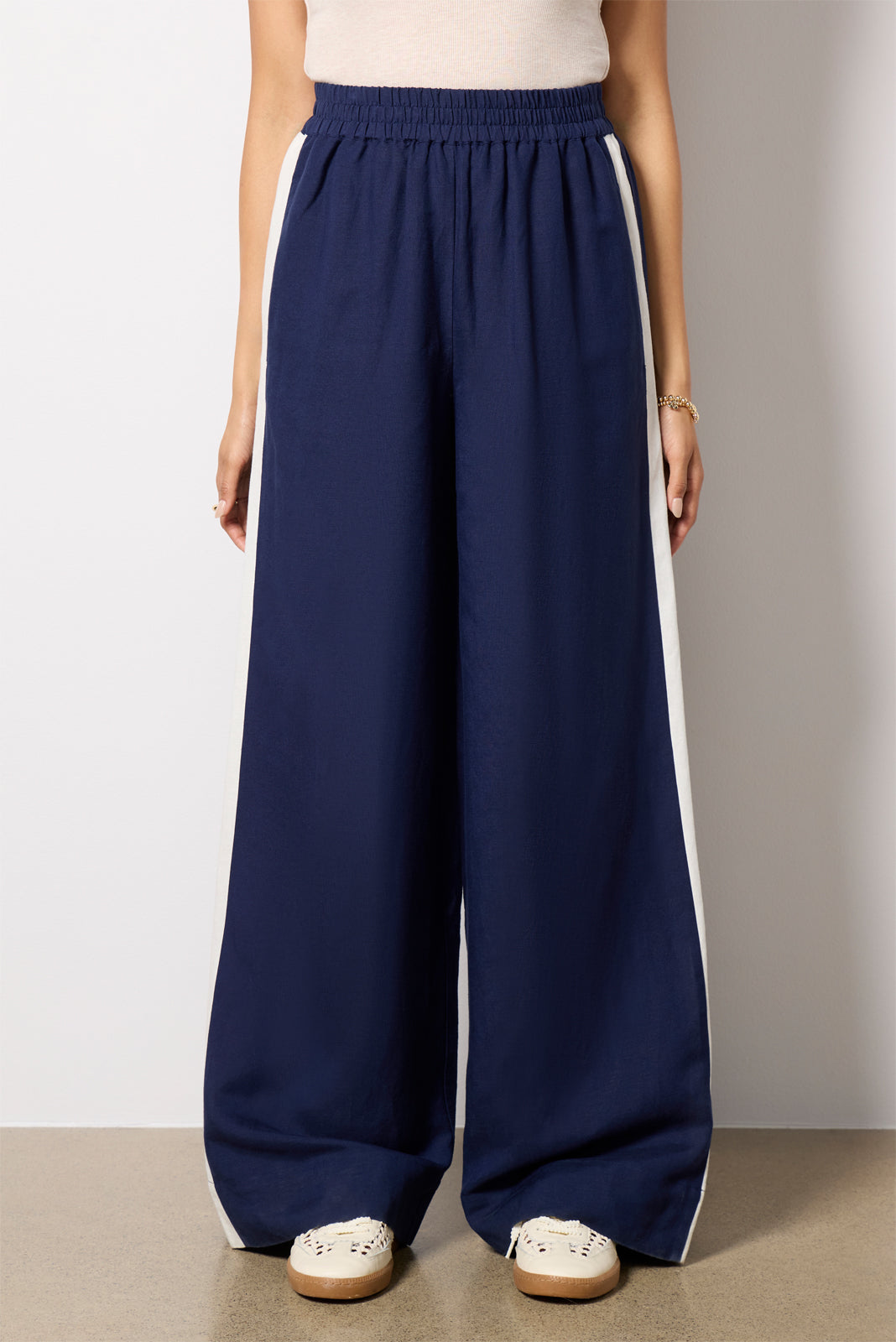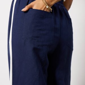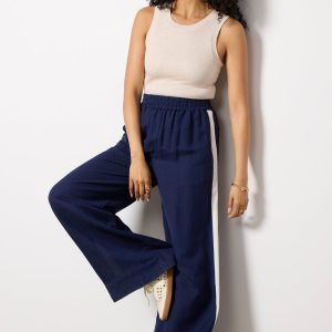 Finished in a breezy linen blend, the Sophia Track Pant by EVEREVE features a voluminous wide leg silhouette with a high-rise elastic waist, full-length inseam, contrasting side stripes, and pockets at the front and back. Pair with the matching Hazel Linen Contrast Cami for a chic summer set.