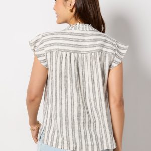 Perfect for your warm-weather wardrobe, this striped top by Sanctuary is crafted in linen-blend fabric and features a relaxed fit, flutter cap sleeves, and a smocked collar with a ruffle detail.