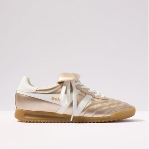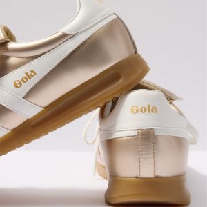 Finished in gold metallic leather, these sporty low-top sneakers by Gola feature a retro-inspired design with a foldover tongue and gum sole.