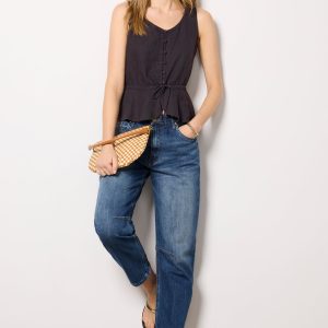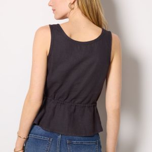 A chic pick for your spring-to-summer wardrobe, this linen-blendtank top by Emerson Fry features a button-front silhouette with covered buttons, a cropped length, and a peplum hem with an adjustable tie detail.