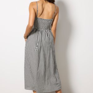 Crafted in breezy cotton, add a feminine touch to your wardrobe with this gorgeous gingham dress by EVEREVE. This everyday dress features a sweetheart neckline with gathering details, a defined waistline, smocking in the back for stretch, and side pockets.