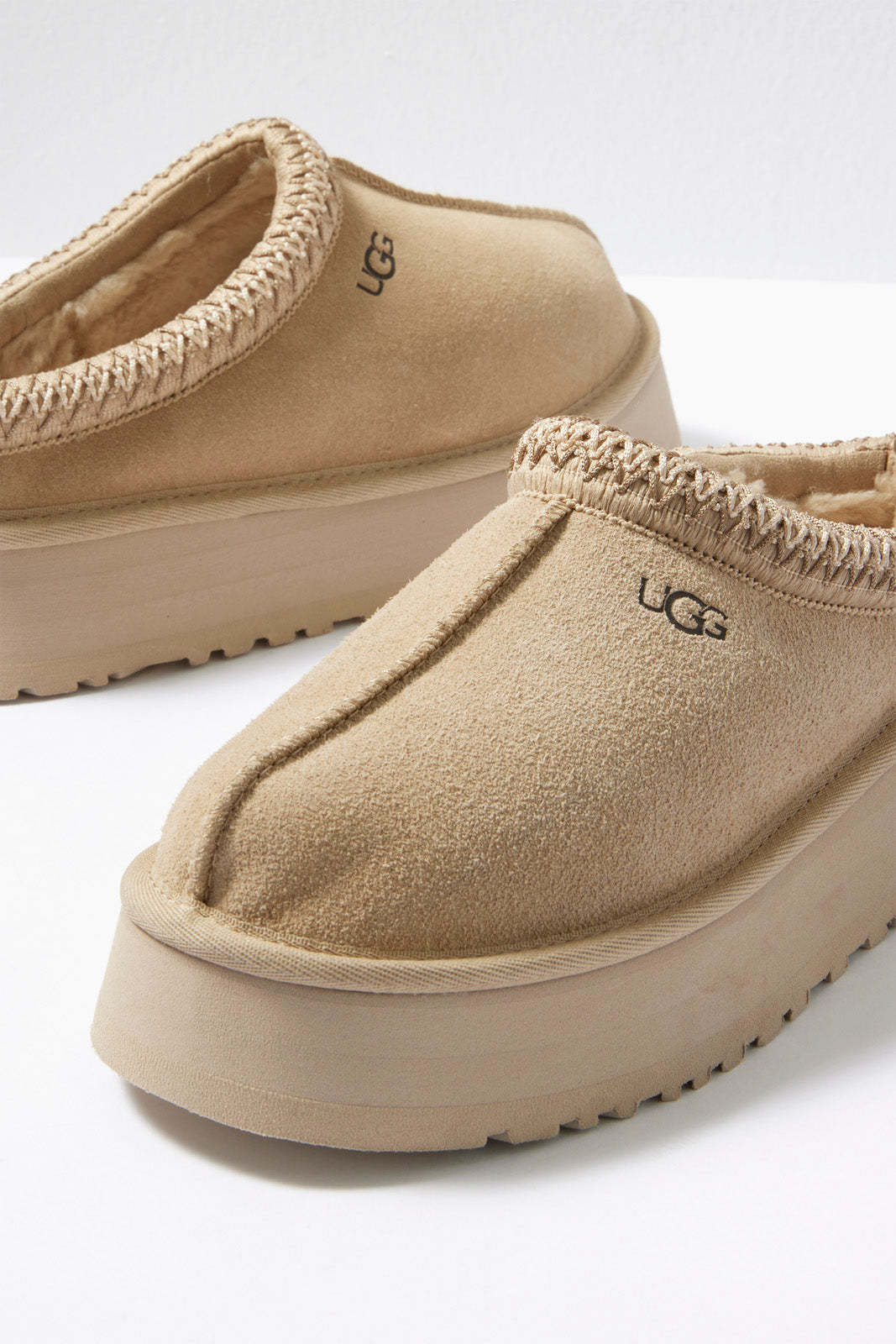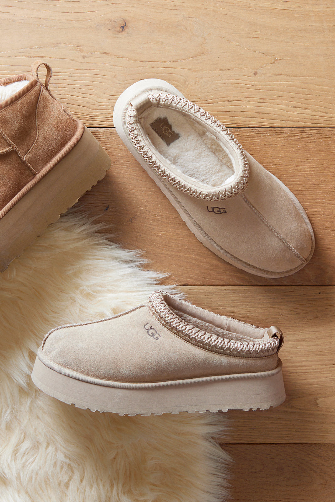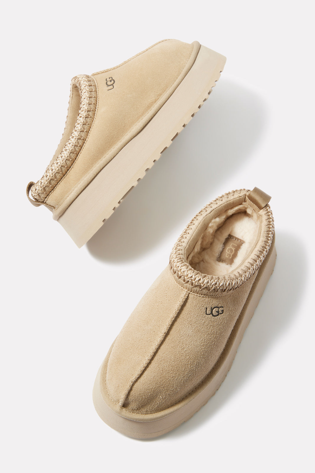 The UGG® Tazz platform slipper is crafted in a suede fabric with an EVA outsole and cozy UGGplush™ lining, a moisture-wicking textile made from a wool-rich blend but made to feel and wear like shearling.