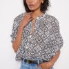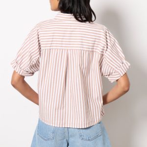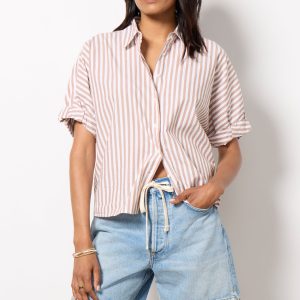 Easy and elevated, this striped button-down shirt by Xirena is finished in crisp cotton fabric and features a relaxed, boxy fit, collared neckline, and rolled short sleeves.