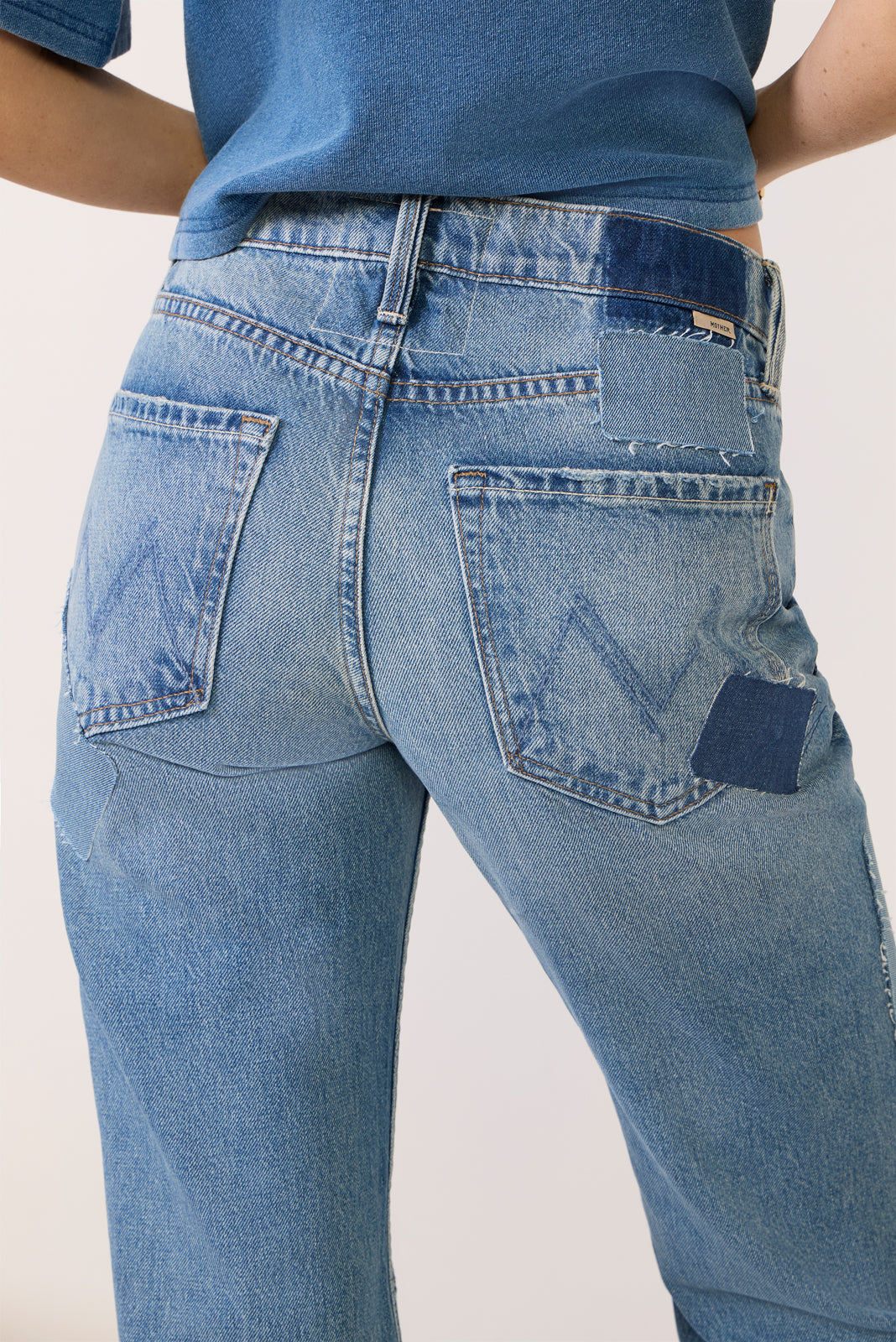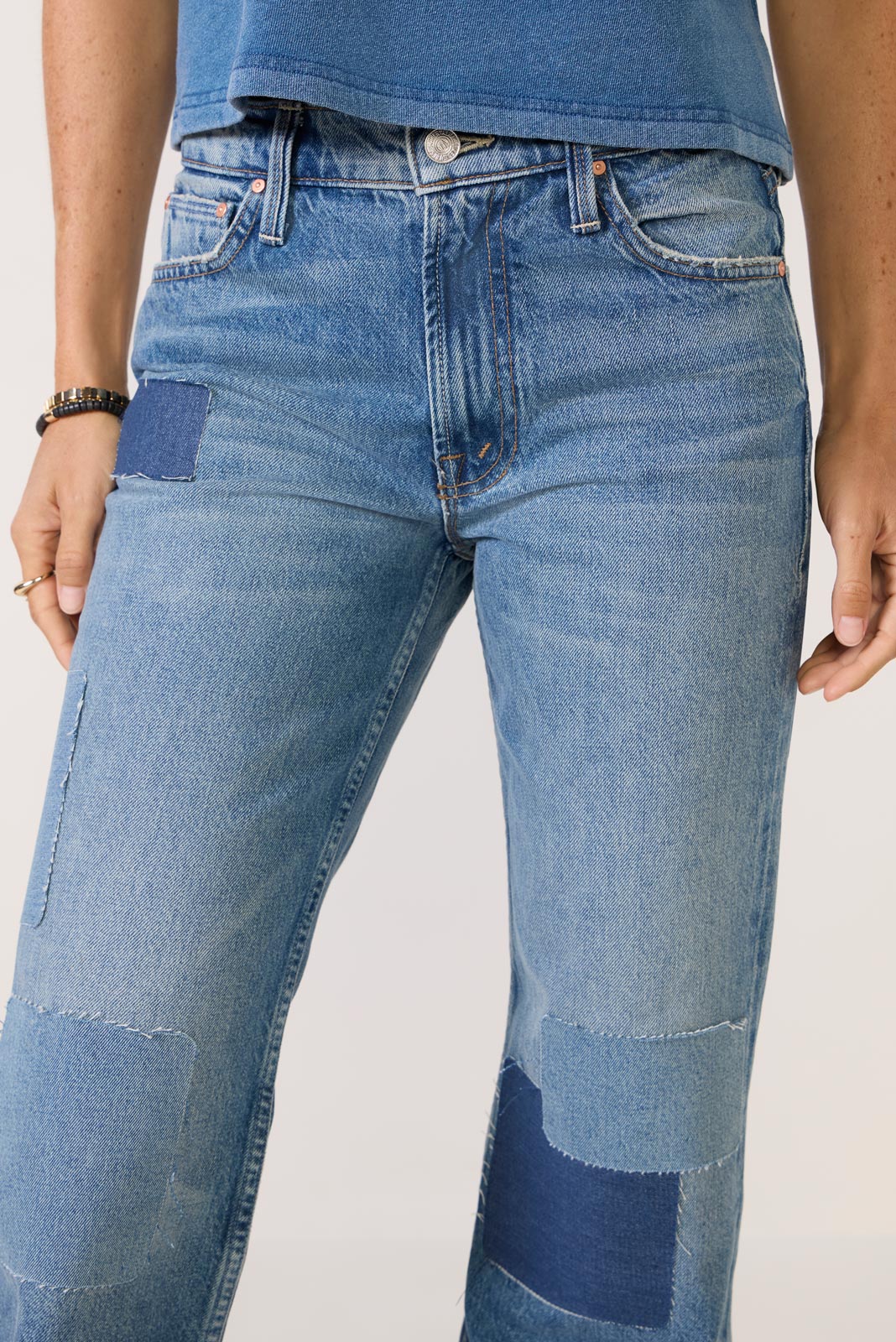 Patchwork details add a lived-in feel to The Bookie Heel bootcut jeans by MOTHER, finished in rigid cotton denim and a full-length relaxed leg.
