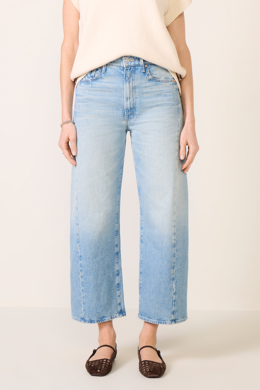 A curved wide leg creates the chic silhouette of The Half-Pipe barrel jean by MOTHER, featuring a high-rise waist, ankle-length hems, and rigid cotton denim in a light blue wash.