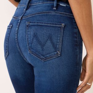 A dark blue wash and subtly flared hems define The Hustler Ankle jean by MOTHER, featuring a high-rise fit, ankle-length inseam, and soft stretch denim fabric.