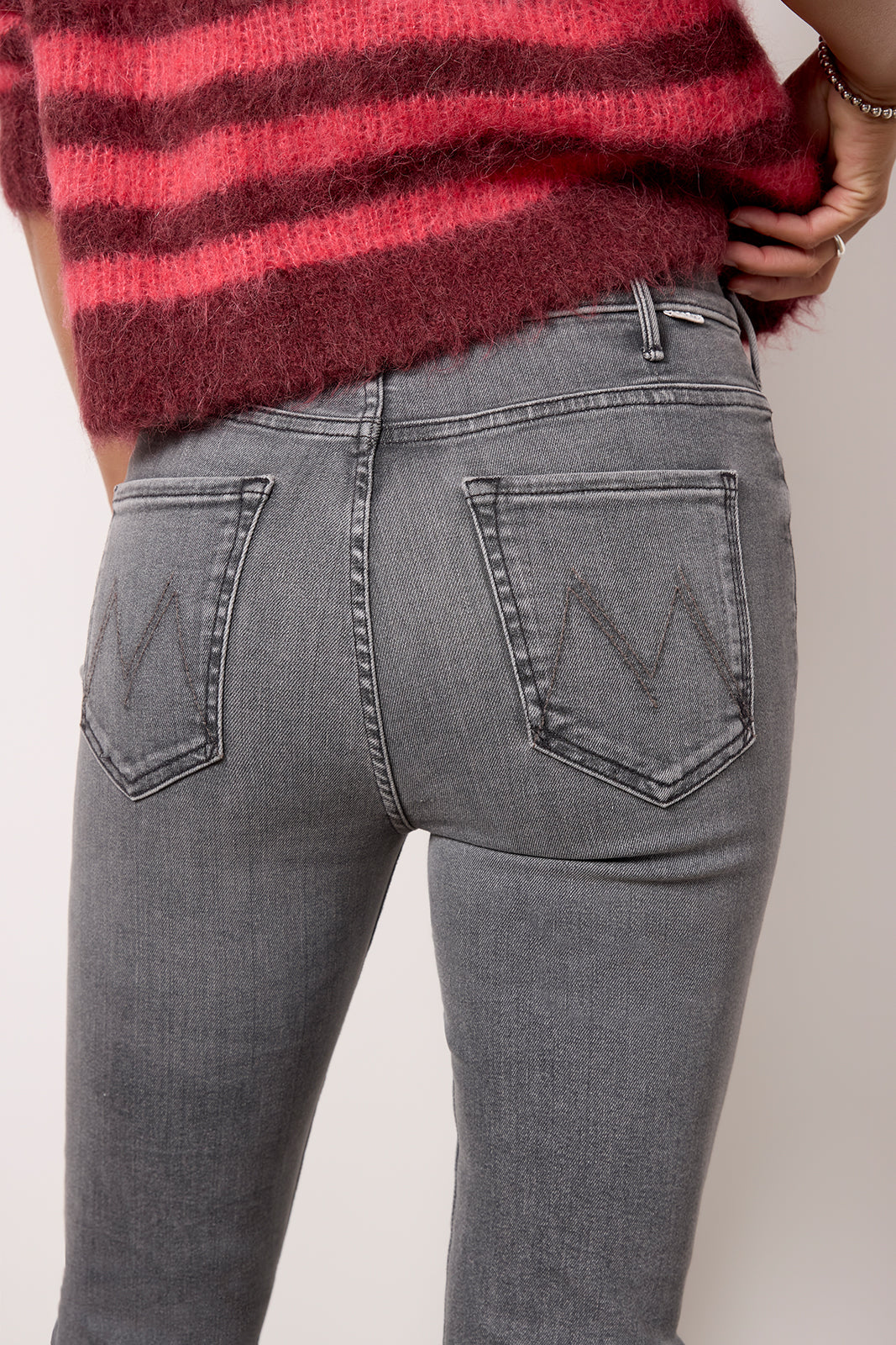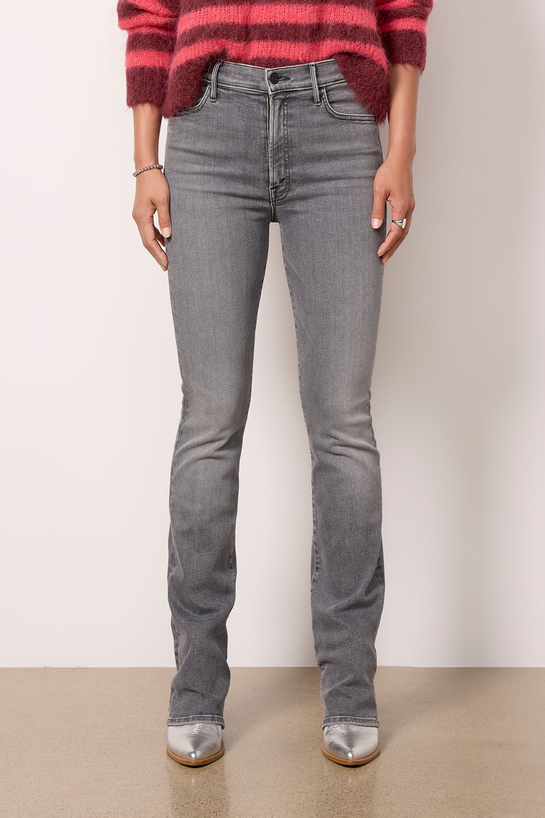 Designed with a long 34″ inseam, the Hustler Heel jean by MOTHER features a straight leg silhouette with a subtle bootcut shape, high-rise waist, and zipper fly closure. The faded grey wash is perfect for day-to-night wear with tees, sweaters, and blouses.