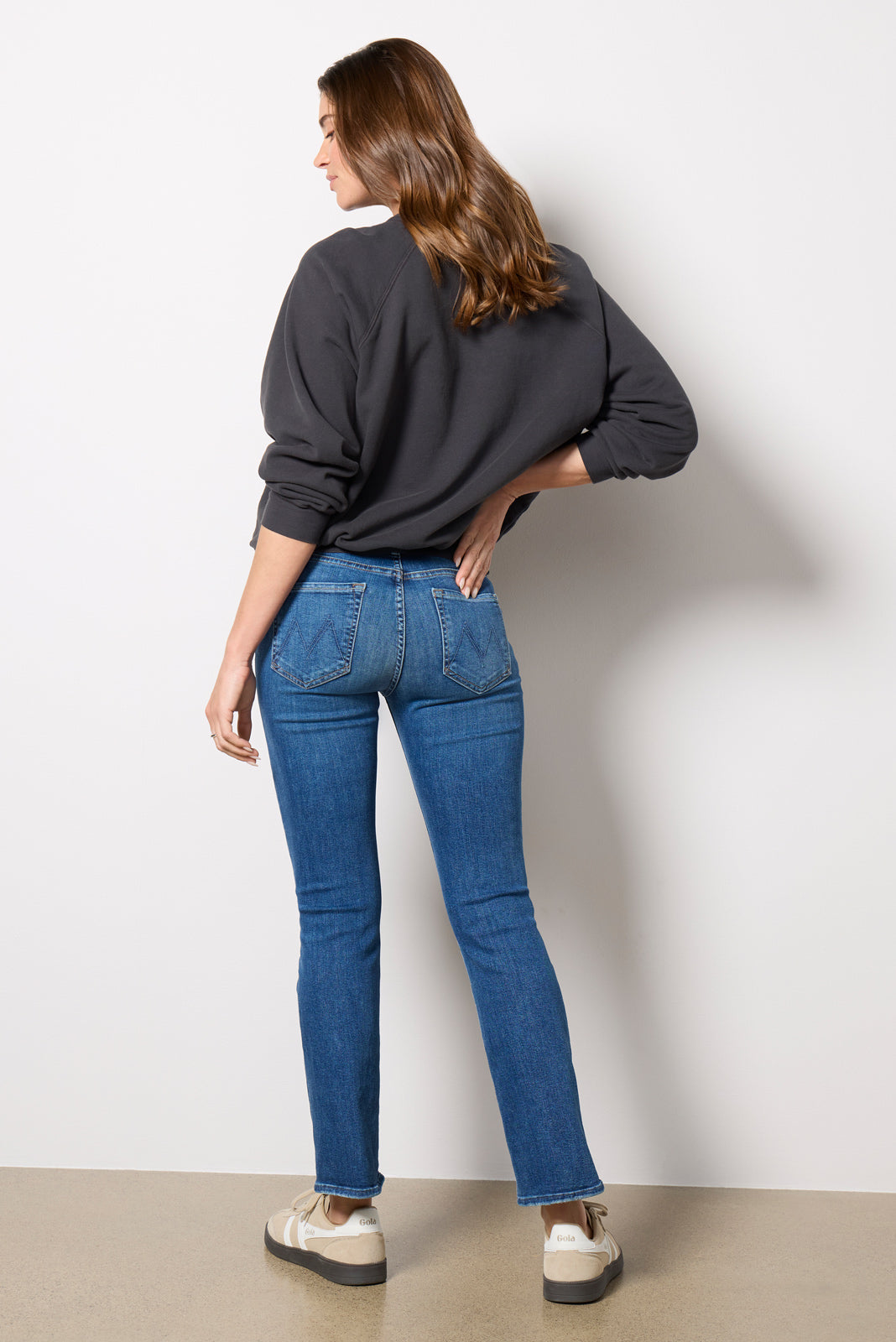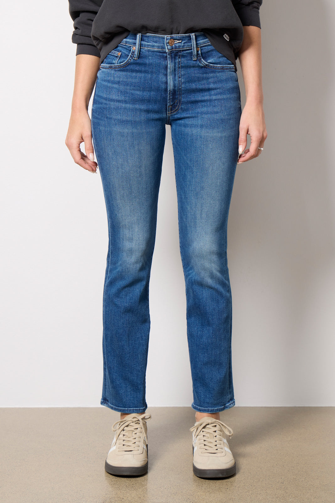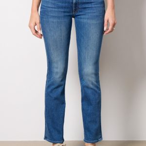Designed with a slim bootcut leg, The Insider Flood jean by MOTHER features clean hems, sustainable stretch denim, and a medium blue wash with fading at the knee.