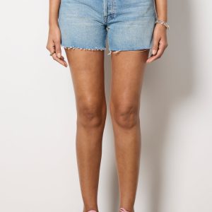 Rigid cotton denim and frayed hems give a vintage feel to these MOTHER jean shorts, finished with a versatile blue wash and longer length.