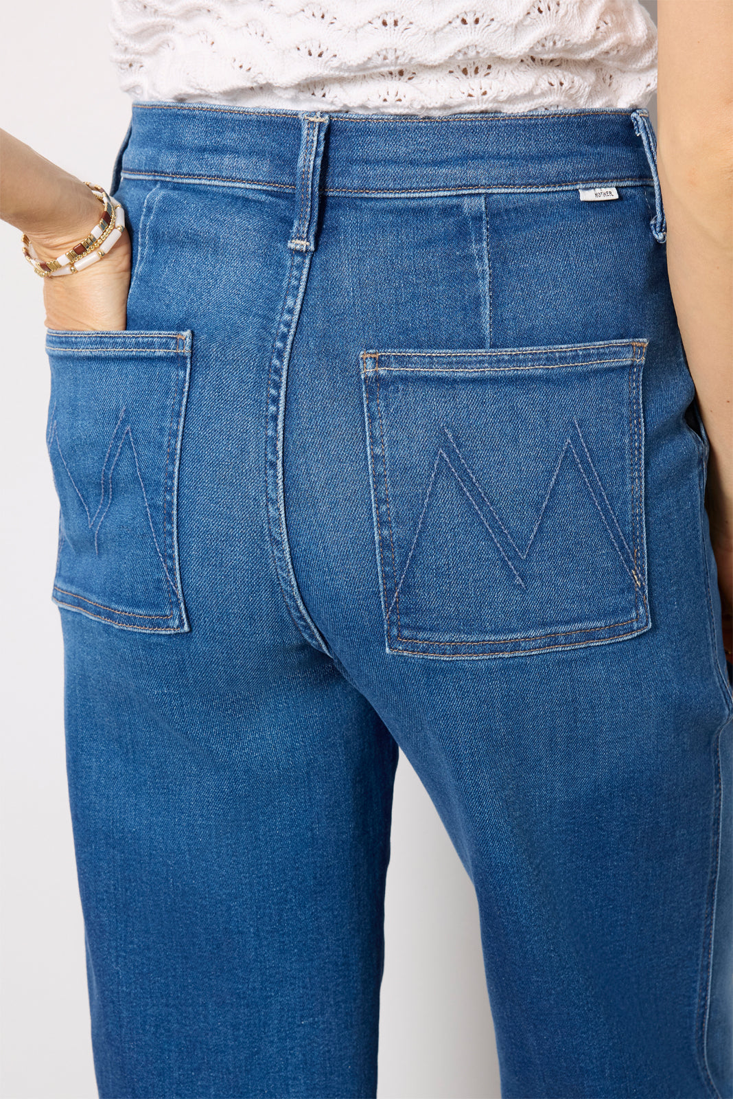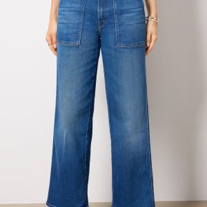 Utility-style pocketselevate The Stitch Up Maven Hover jean by MOTHER. These wide leg jeans are cut from soft stretch denim and feature a high-rise fit, faded blue wash, and 29″ inseam.