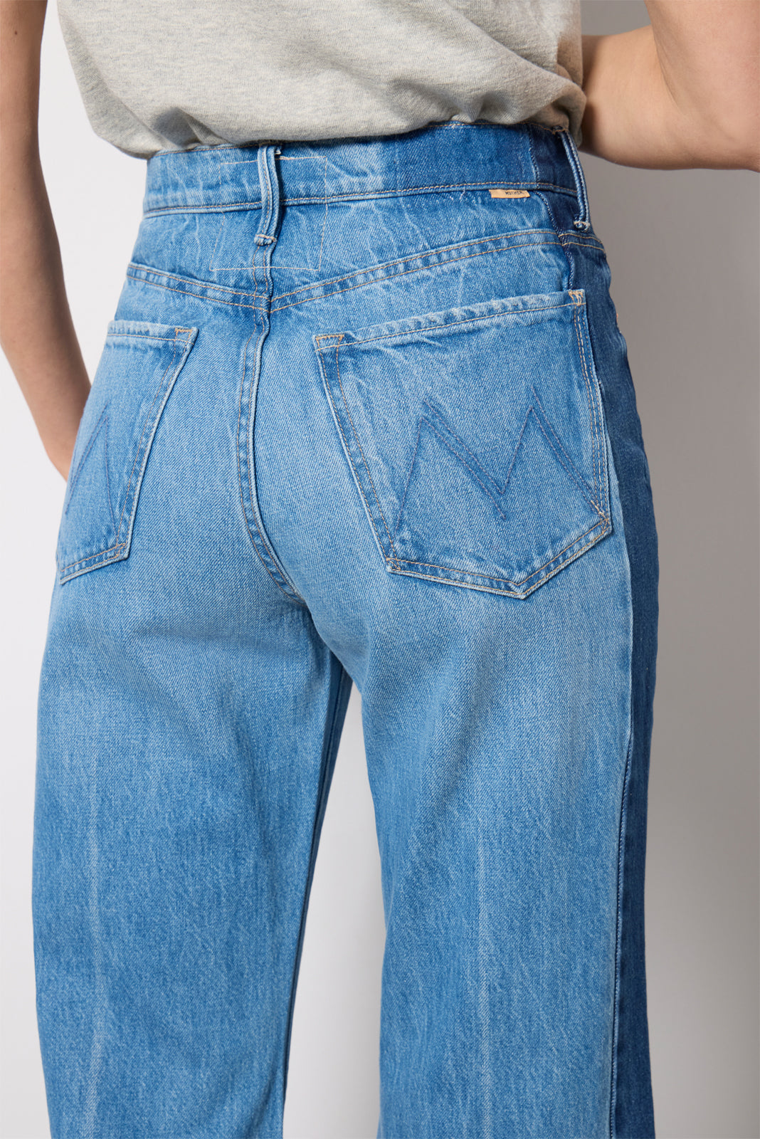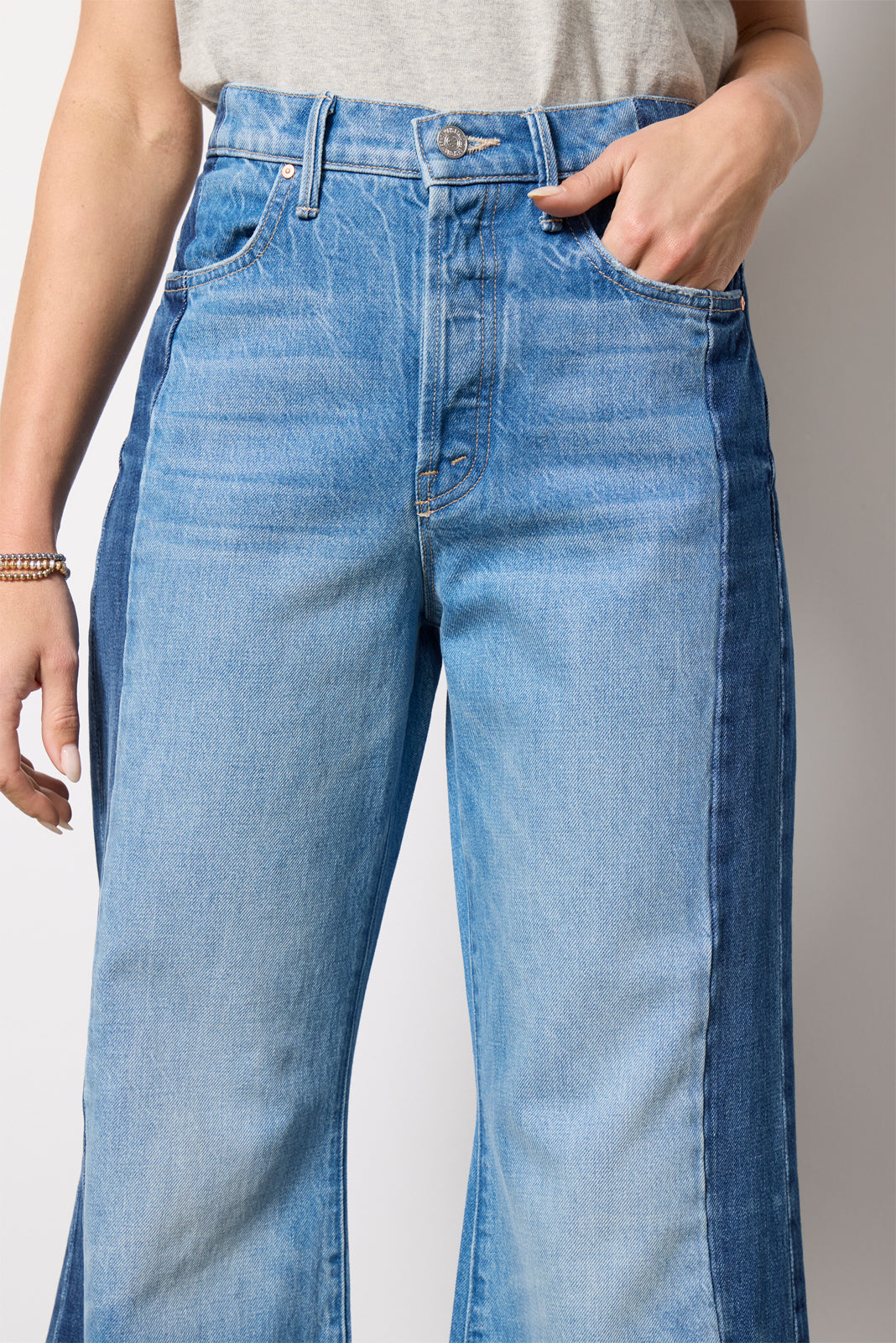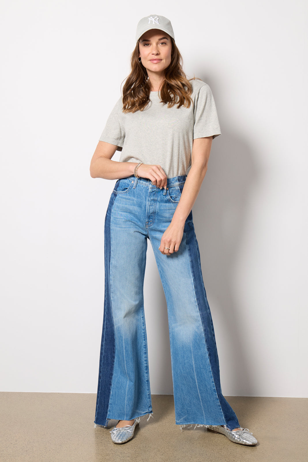 Add bold style to your denim collection with The Tux Sidestepper Sneak Fray jean by MOTHER. Designed with darker panels down the sides, these wide leg jeans are crafted in rigid cotton denim with a high-rise waist, full-length leg, and frayed uneven hems.