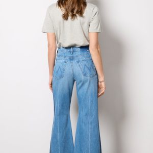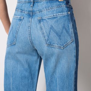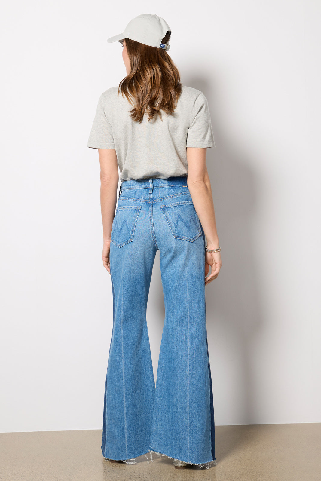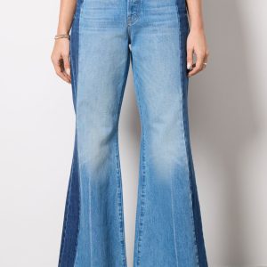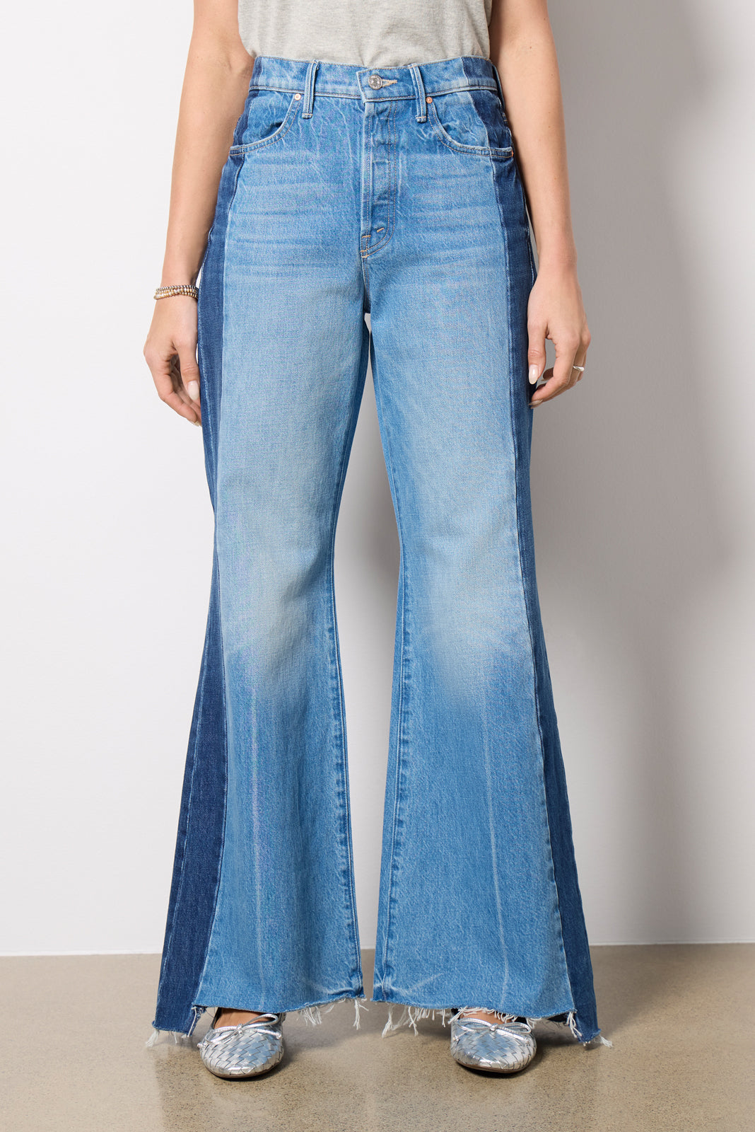 Add bold style to your denim collection with The Tux Sidestepper Sneak Fray jean by MOTHER. Designed with darker panels down the sides, these wide leg jeans are crafted in rigid cotton denim with a high-rise waist, full-length leg, and frayed uneven hems.