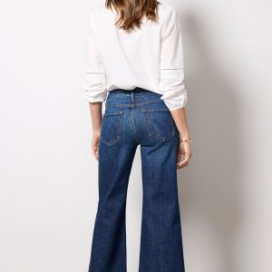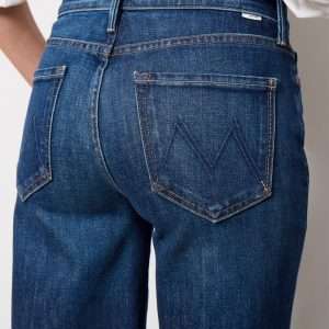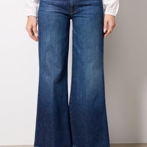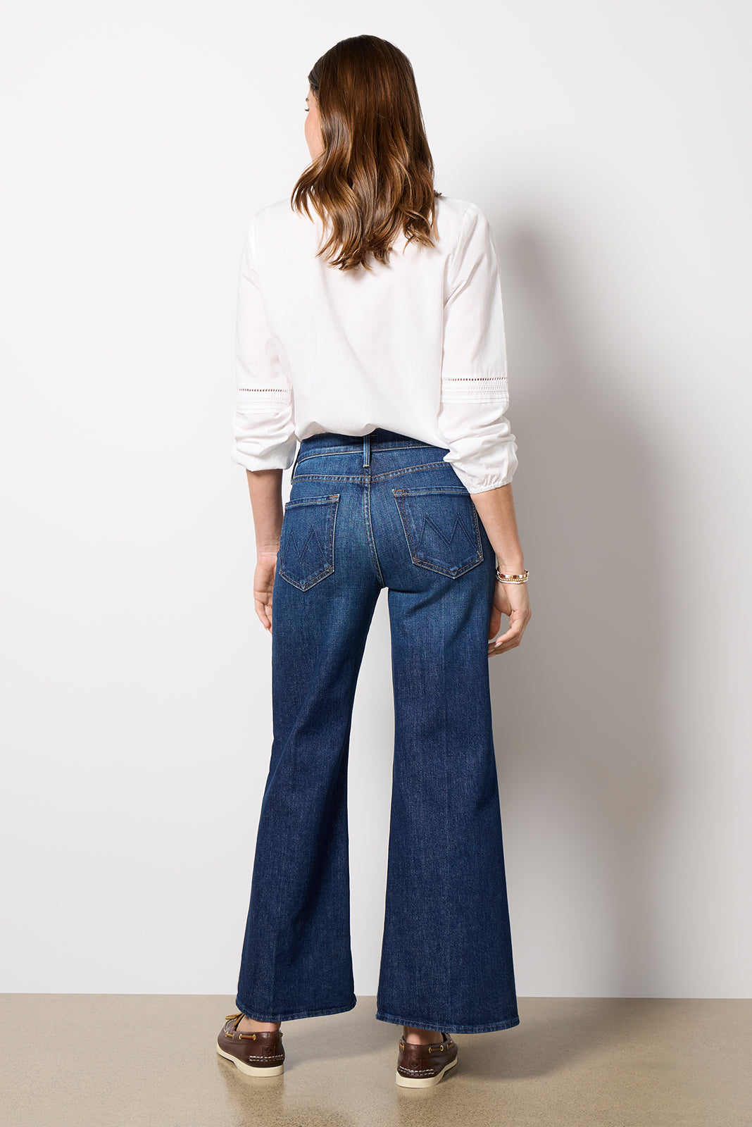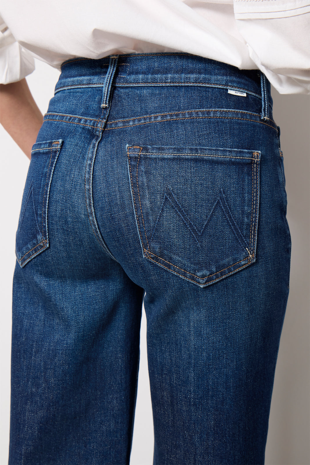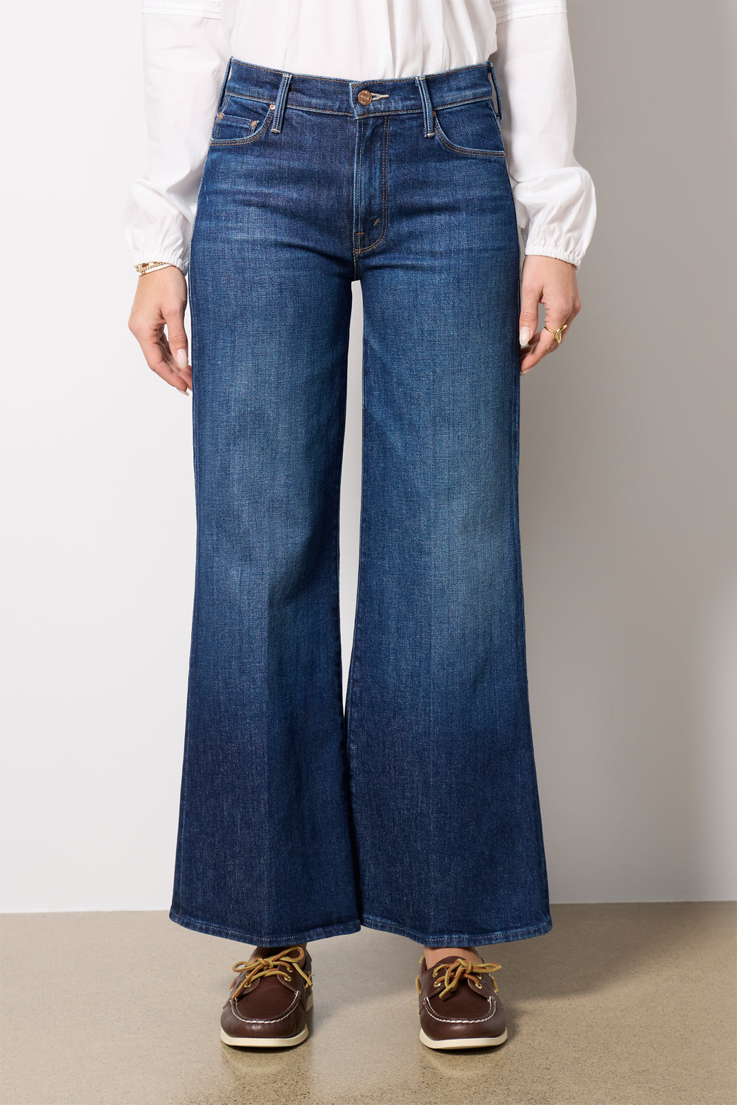 A flared wide leg defines the stylish Twister Flood jean by MOTHER, featuring an ankle-length inseam, clean hems, and dark-wash denim with fading at the knee.