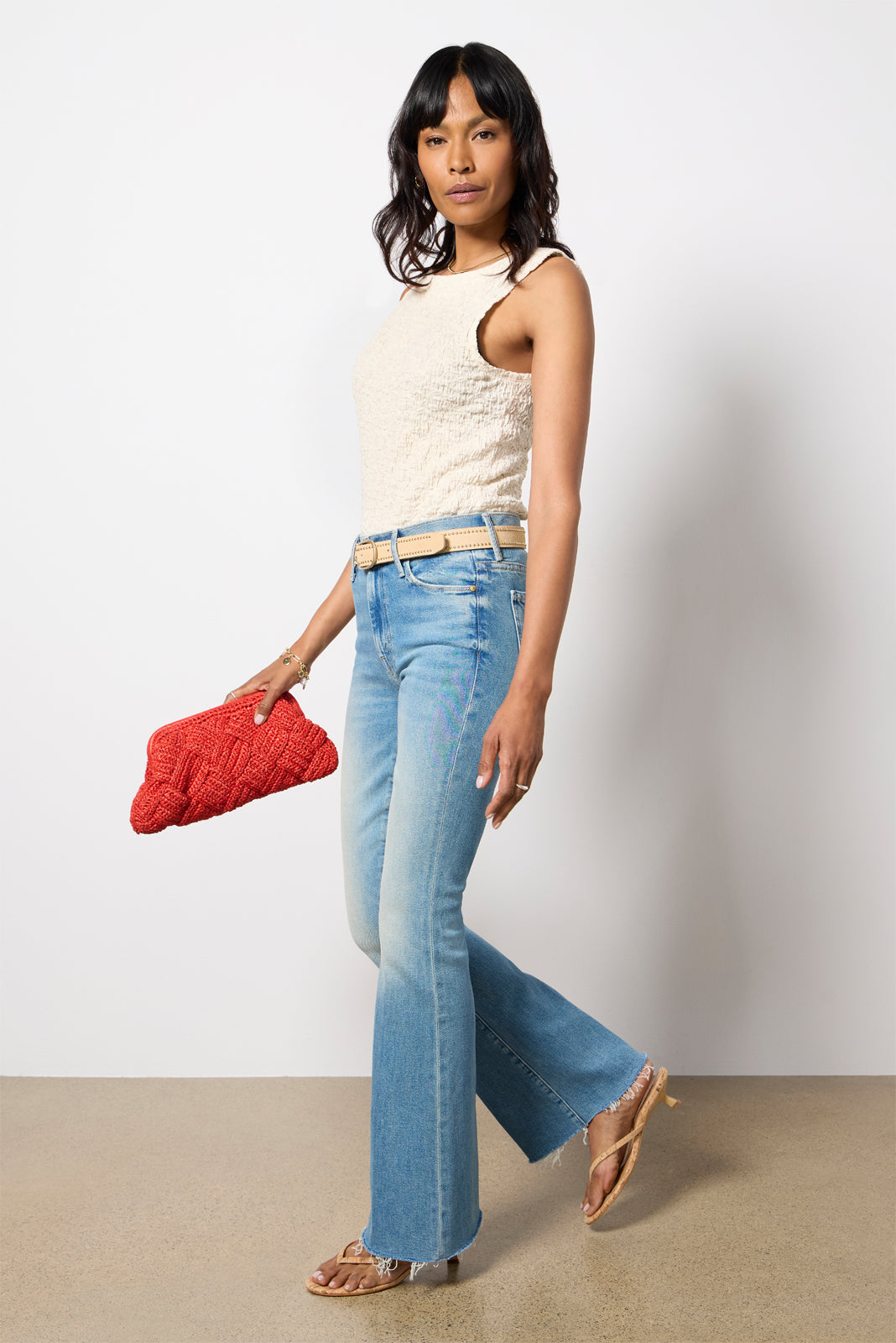 Finished with full-length raw hems, the Weekender Fray flare jean by MOTHER is crafted in soft stretch denimwith a flattering mid-rise waist and faded light blue wash.